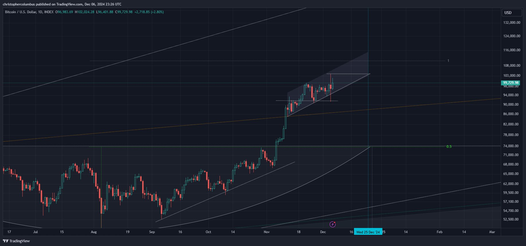 Trader ẩn danh – Dave the Wave nói với 147.000 người theo dõi của mình trên nền tảng truyền thông X rằng BTC đang trong một kênh tăng dần với mục tiêu khoảng $112.000 có thể đạt được vào ngày 25 tháng 12.