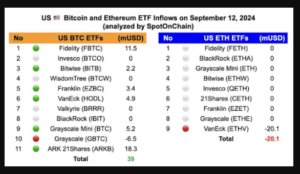 Các Bitcoin ETF giao ngay của Hoa Kỳ đã chứng kiến ​​dòng tiền tích cực, với 39,02 triệu USD vào ngày 12 tháng 9, đánh dấu sự đảo ngược so với khối lượng thấp trước đó. Ngược lại, các Ethereum ETF tiếp tục ghi nhận dòng tiền chảy ra ròng là 20,14 triệu USD.