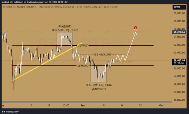 Biến động giá gần đây của Bitcoin đã hình thành một mô hình biểu đồ hấp dẫn, báo hiệu sự đảo ngược tăng giá và đẩy Bitcoin lên mức $65.000. Mô hình vai-đầu-vai đảo ngược (H&S) đang xuất hiện, cho thấy mục tiêu giá tiềm năng là khoảng $65.000. Tuy nhiên, điều này đòi hỏi BTC phải vượt qua vùng hợp nhất hiện tại ($62.000).