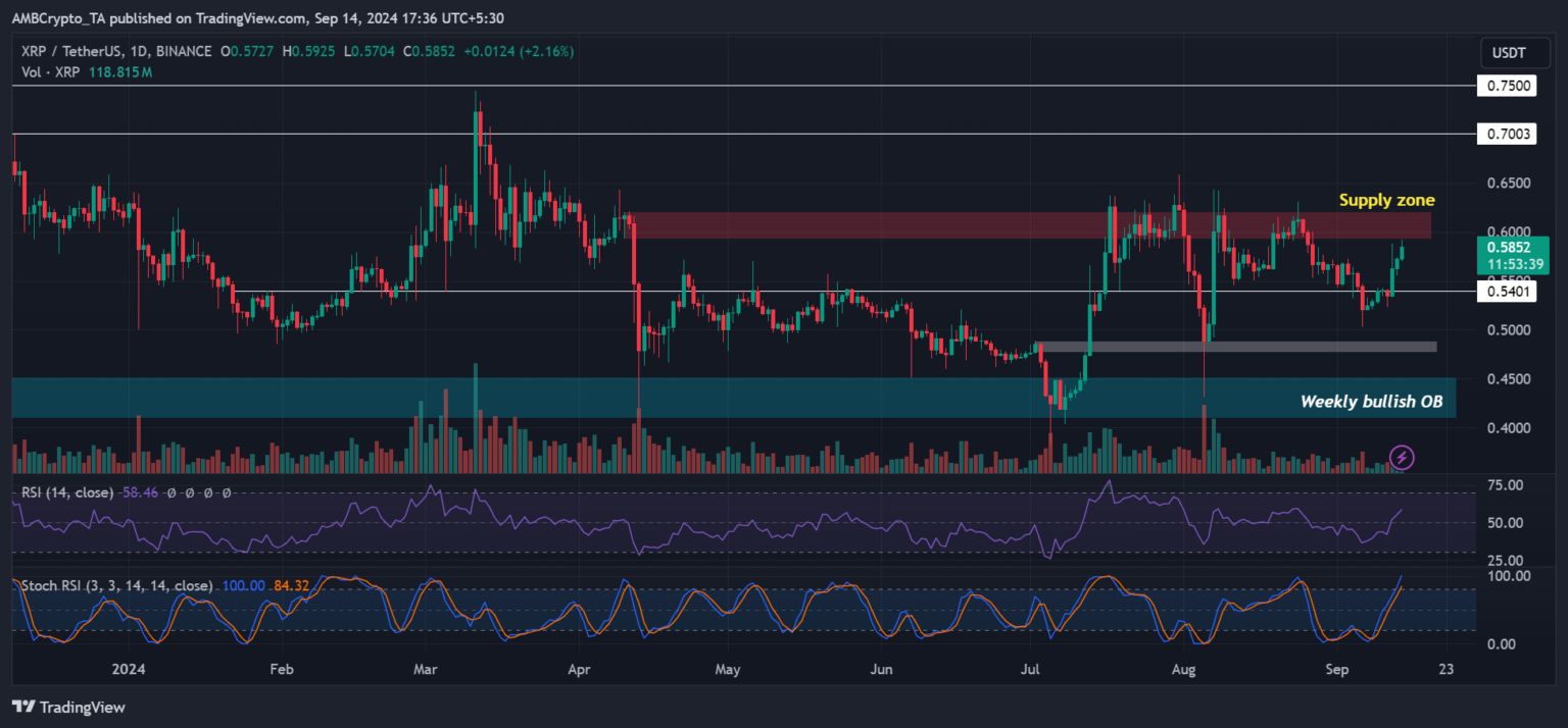 Hiện tại, đà tăng của tuần này đang hướng đến vùng cung. Nếu xu hướng lặp lại và giá tiếp tục giảm, XRP có thể bị kéo xuống mức hỗ trợ $0,54.