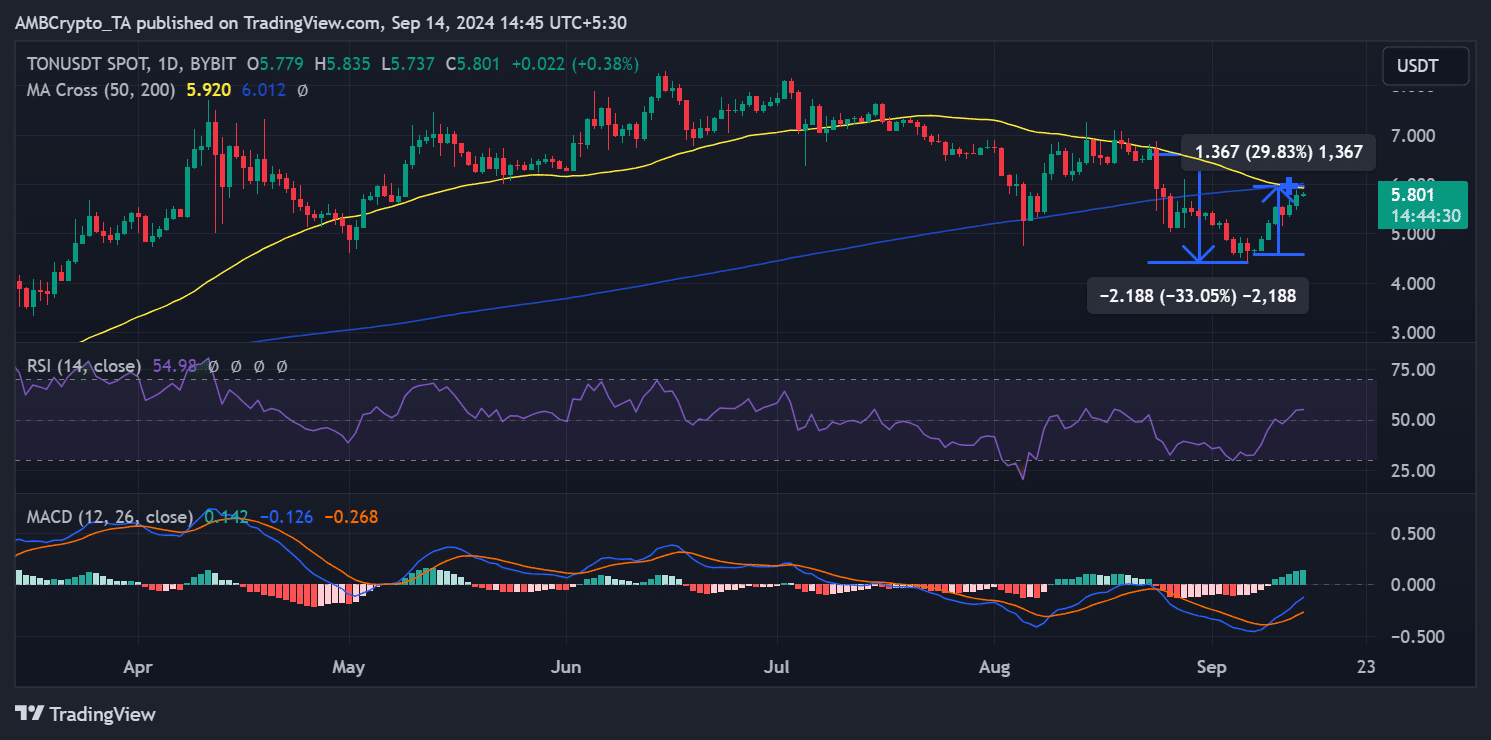 Biểu đồ cho thấy giá đã tăng lên khoảng $5,77 sau khi tăng 3,5% vào ngày 13 tháng 9. Đây là sự phục hồi đáng kể đối với Toncoin, vốn đã ghi nhận mức giảm mạnh hơn 30% trong khoảng thời gian từ ngày 24 tháng 8 đến ngày 6 tháng 9.