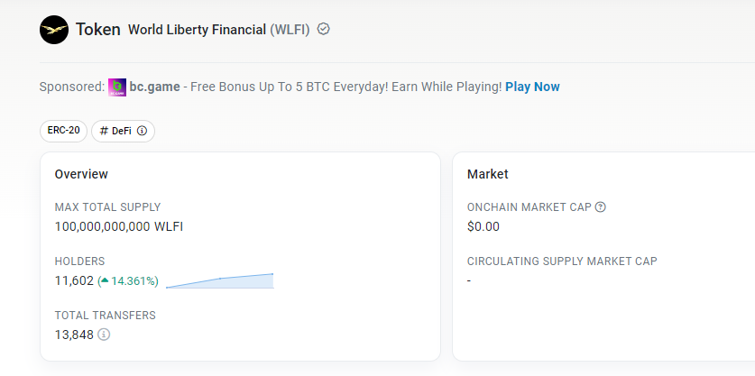 Tại thời điểm viết bài, giá token WLFI là 0,015 đô la, với hầu hết người đầu tư chưa tới 1.000 đô la. Trong số đó, một ví nổi bật đã chi 351,3 ETH (khoảng 903.000 đô la) để mua 60,43 triệu token. Theo dữ liệu từ Etherscan, WLFI hiện có hơn 11.602 hodler, ghi nhận mức tăng 14,36% trong vòng 24 giờ qua.