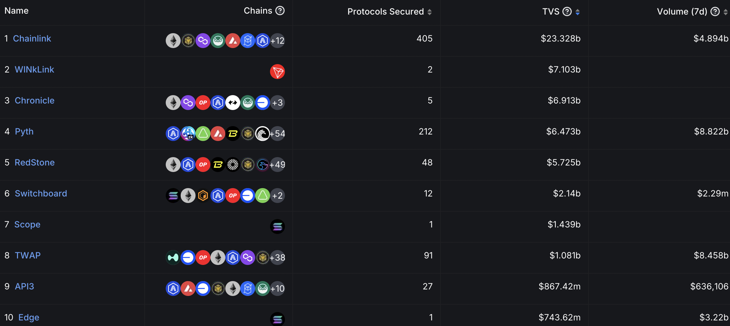 Theo dữ liệu từ DeFiLlama, Chainlink (LINK) và các oracle Pyth Network (PYTH), WINKLink (WIN), Chronicle (XNL), RedStone và Switchboard đã đảm nhận nhiệm vụ bảo mật cho hơn 50 tỷ USD tài sản tiền điện tử trên các blockchain.