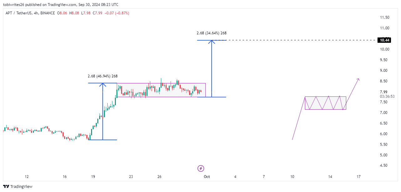 APT hiện đang trong giai đoạn hợp nhất, tiền thân của đợt tăng giá mạnh mẽ. Trong giai đoạn này, trader thường tích lũy các vị thế, mua thêm APT với niềm tin về động thái tăng giá.