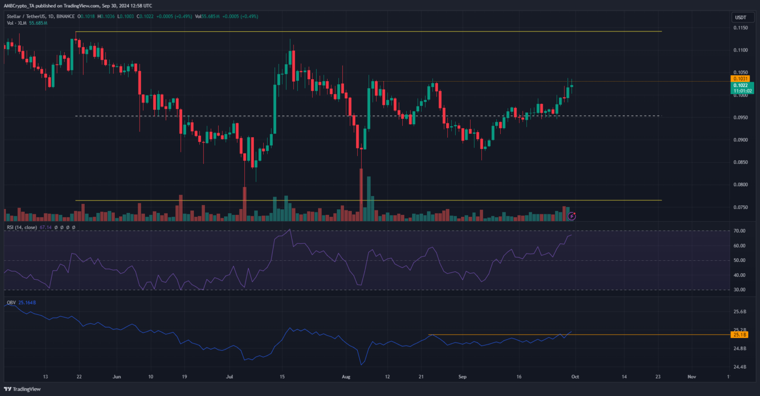 Mức kháng cự $0,103 đã tồn tại kể từ tháng 8. Đây là lần thứ ba kể từ đó, phe bò XLM cố gắng vượt mức này. Thị trường có thể sẽ tiếp tục bị từ chối, đặc biệt là khi động lực tăng giá từ BTC suy yếu, trừ khi XLM thành công trong việc lật mức này thành hỗ trợ.