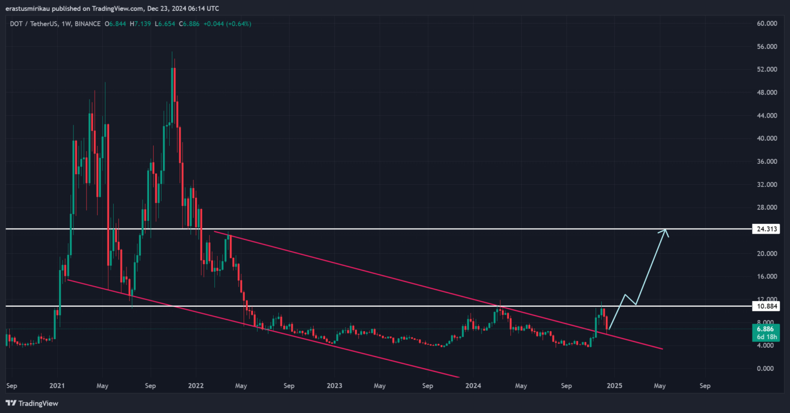 Việc breakout mô hình nêm giảm dần trên biểu đồ của Polkadot làm nổi bật tiềm năng đảo chiều tăng giá mạnh mẽ. Giá hiện đang đối mặt với mức kháng cự lớn đầu tiên tại $10,88, với mục tiêu trung hạn là $24.