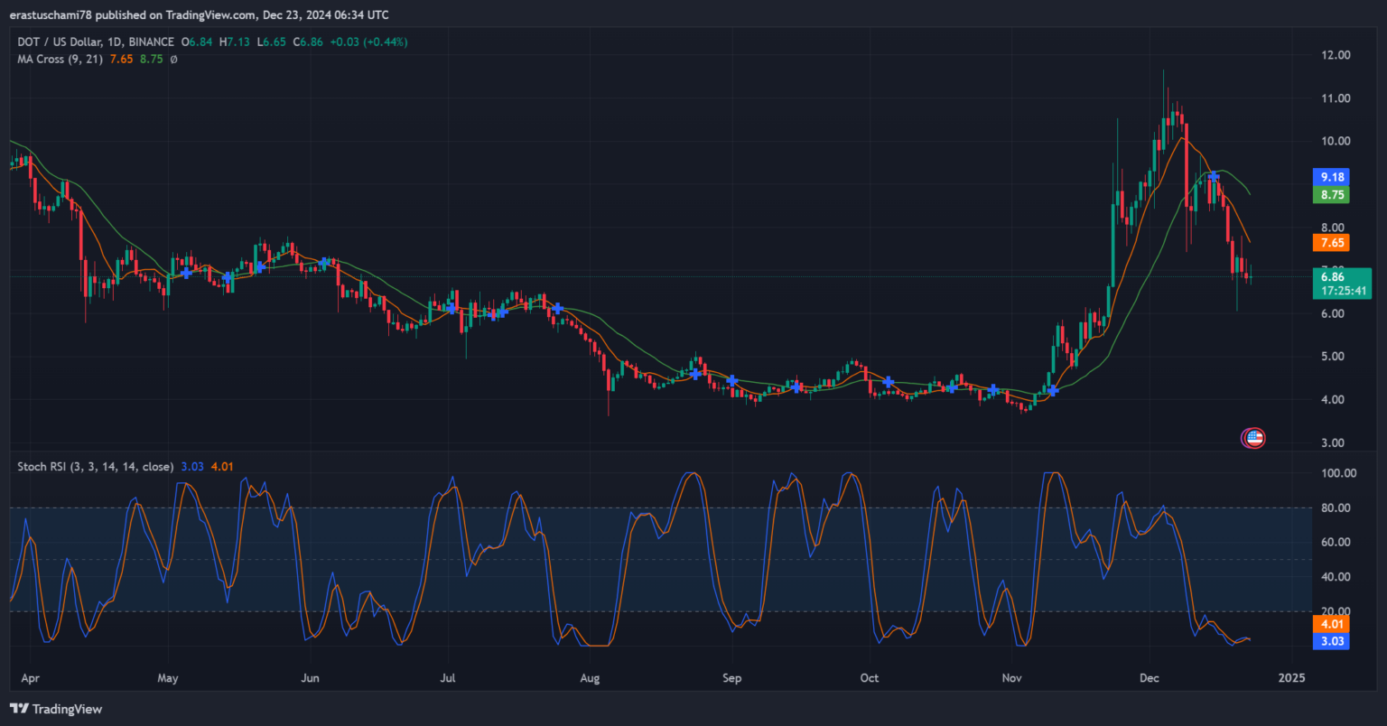 Các chỉ báo kỹ thuật tiếp tục hỗ trợ tiềm năng tăng giá của Polkadot. RSI stochastic đang trong tình trạng quá bán, với giá trị gần 3,03 và 4,01, cho thấy giá có khả năng phục hồi trong ngắn hạn.