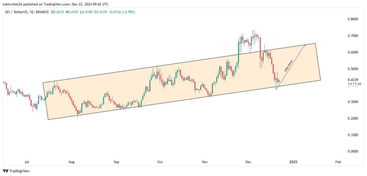 Trên biểu đồ, SEI đã thoái lui về ranh giới dưới của kênh tăng dần, còn được gọi là hỗ trợ, sau khi trải qua sự từ chối mạnh mẽ tại mức kháng cự của kênh.