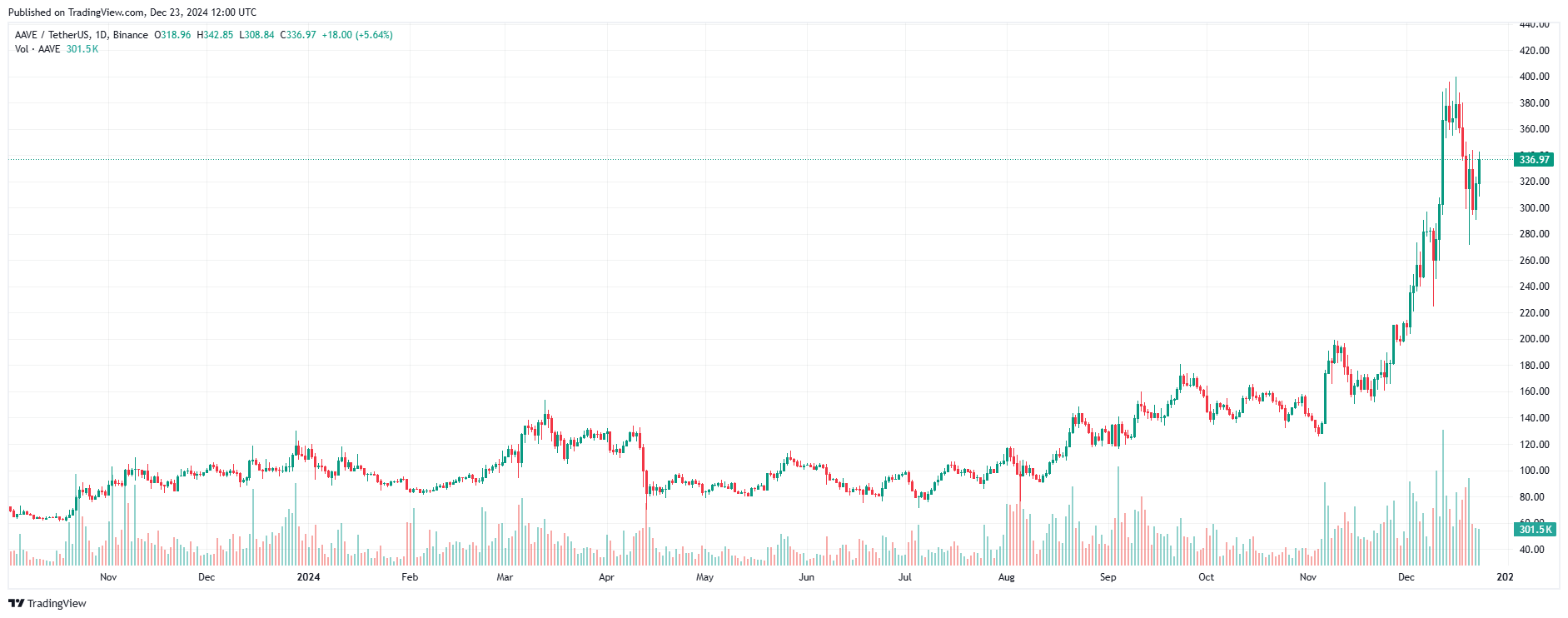Giá token AAVE đã ghi nhận mức cao nhất trong 3 năm tại $395 vào ngày 17 tháng 12 năm nay. Lần cuối cùng token này ghi nhận mức giá này là vào tháng 9 năm 2021. Có nhiều lý do cho mức tăng giá này, bao gồm các điều kiện kinh tế vĩ mô và sự phát triển của Aave.