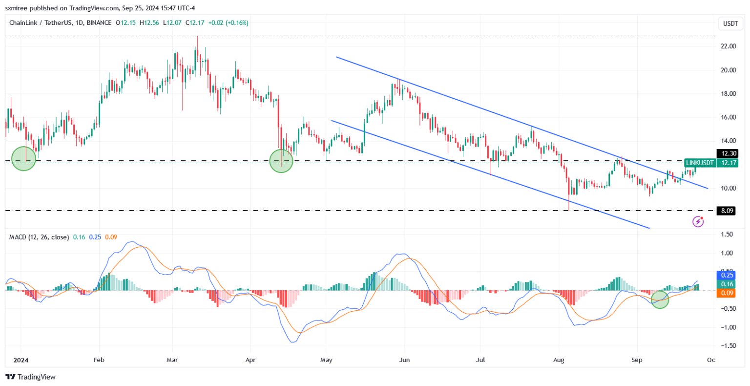 Trên khung thời gian hàng ngày, LINK đã giao dịch trên mô hình kênh giảm kéo dài trong 7 ngày qua sau khi breakout vào ngày 18 tháng 9. Cặp LINK/USD có mức hỗ trợ tức thời và dài hạn lần lượt là $8,09 và $5,68.