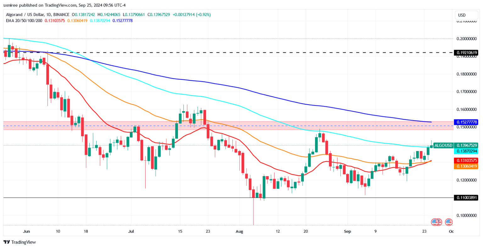 Algorand (ALGO) đang được giao dịch ở mức $0,14 vào thời điểm hiện tại, đối mặt với áp lực giảm xuống dưới đường trung bình động EMA 200 ngày.