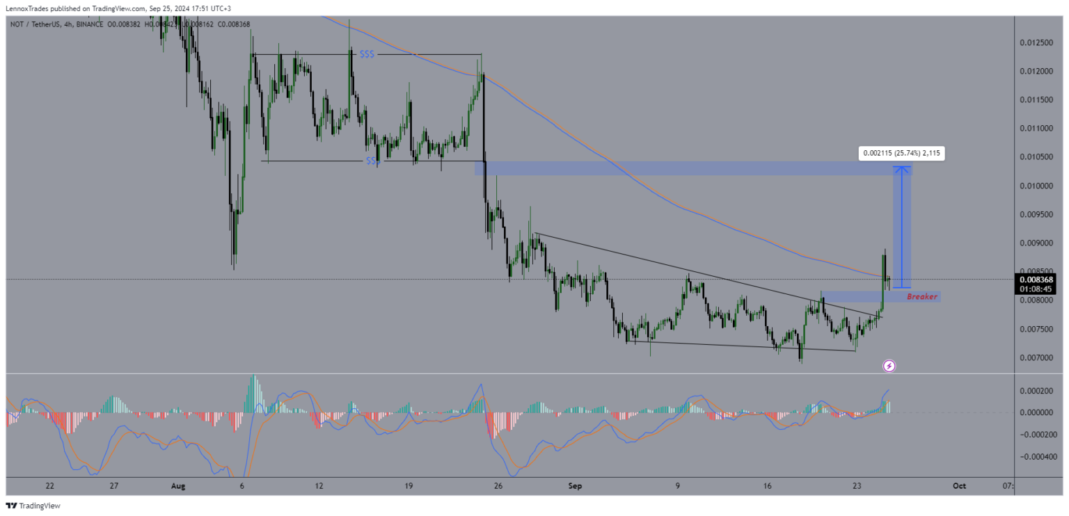 Phân tích hành động giá của cặp NOT/USDT cho thấy dấu hiệu rõ ràng của động lực tăng giá. Trên khung thời gian 4 giờ, Notcoin (NOT) gần đây đã thoát khỏi mô hình nêm giảm, nơi nó đã củng cố trong tháng 8.