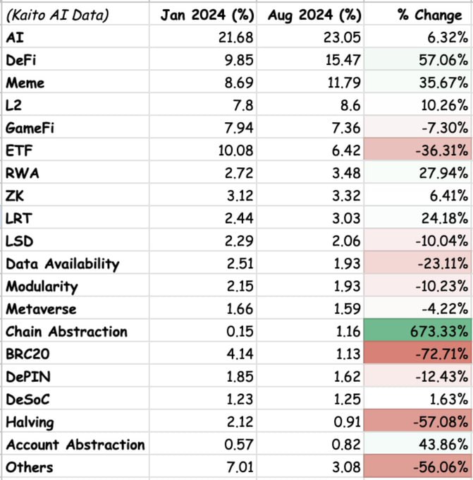 Theo nghiên cứu của Kaito AI – AI, DeFi, MEME và L2 được xếp hạng trong bốn vị trí hàng đầu về mức độ quan tâm đến tiền điện tử từ tháng 1 đến cuối tháng 8 năm nay.