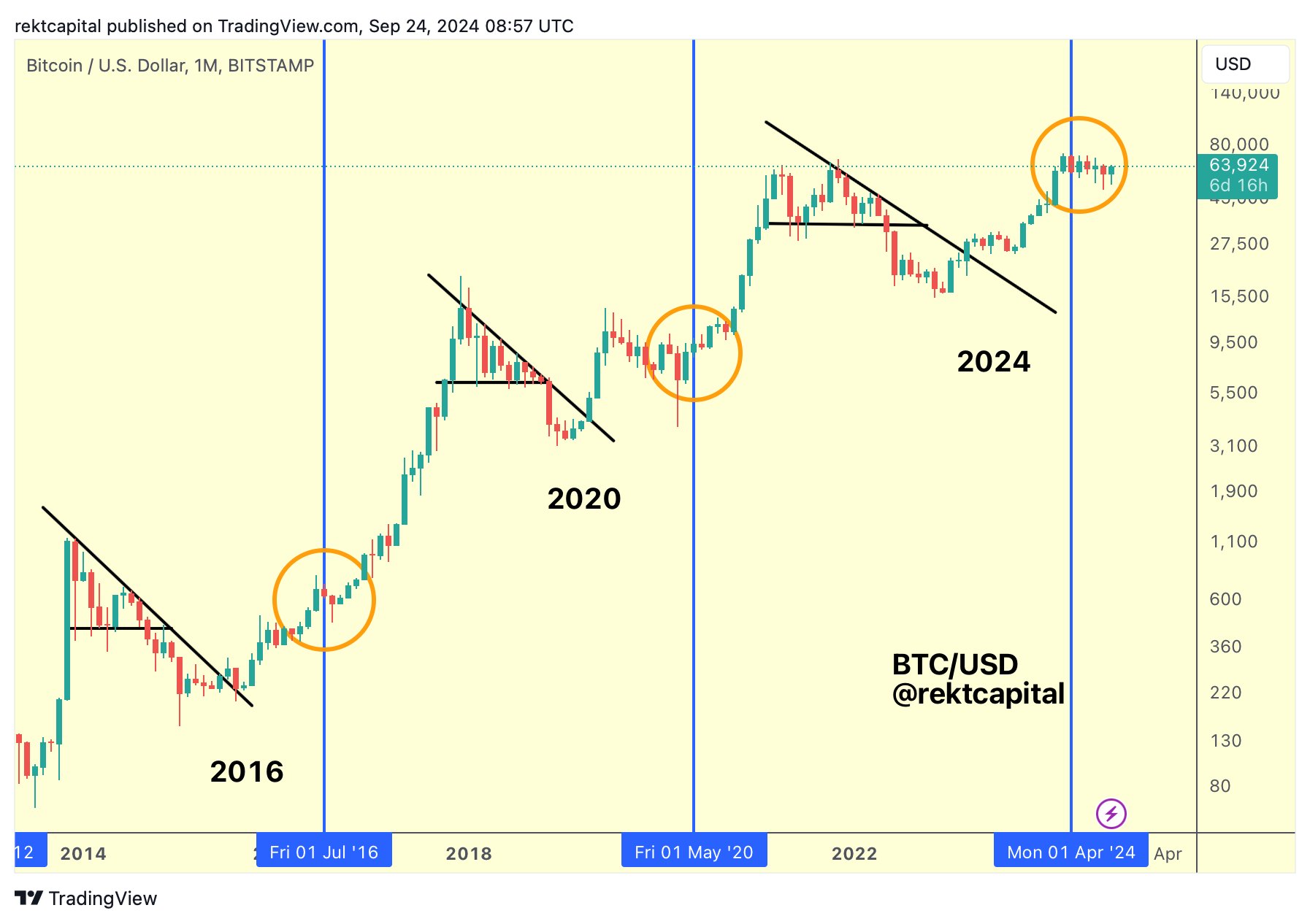 Trader ẩn danh có tên là Rekt Capital nói với 501.400 người theo dõi của mình trên nền tảng truyền thông X rằng, BTC đã từng breakout khỏi phạm vi tái tích lũy của mình trong vòng 154-161 ngày sau khi halving.