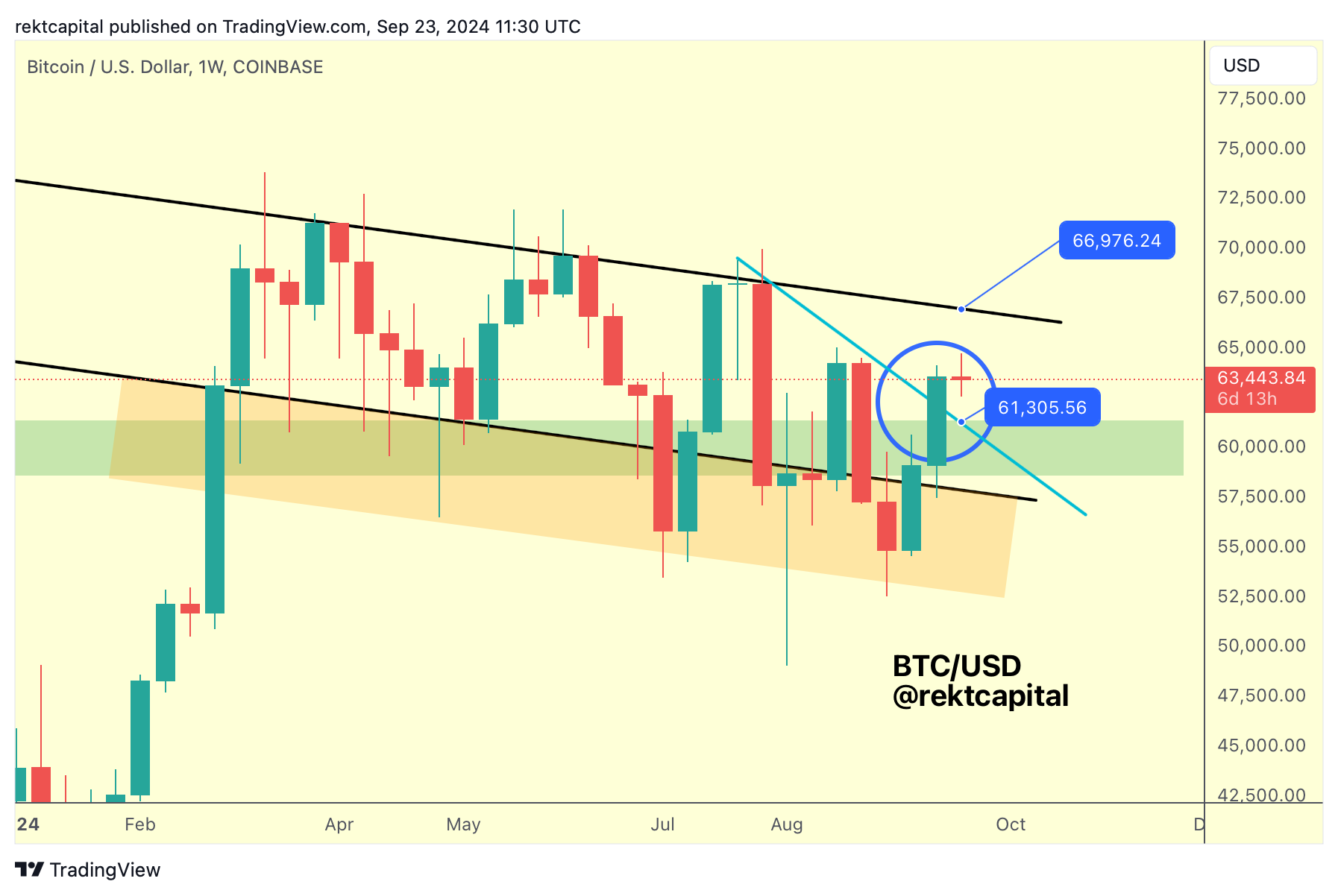“Bitcoin cần Đóng cửa hàng tuần trên Đường xu hướng giảm ở mức $61.900 và tài sản đã làm được điều đó, thậm chí còn vượt xa mong đợi. Do đó, xu hướng giảm đã kết thúc. Tuy nhiên, giá thường sẽ quay trở lại kiểm tra đường xu hướng giảm cũ đó để biến nó thành mức hỗ trợ mới, từ đó xác nhận breakout hoàn toàn. Trong thời gian tới, BTC vẫn có khả năng sẽ quay trở lại vùng $61.300 trước khi tiếp tục đà tăng”.