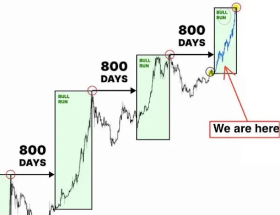 Dựa trên xu hướng tăng giá tái diễn này, Thagapsov dự đoán rằng BTC sẽ bật lên 450% và cán mốc $330.000 trong chu kỳ thị trường năm 2024. Giữa mỗi chu kỳ bốn năm, Thagapsov ước tính có khoảng 800 ngày trước đợt tăng giá Bitcoin. Dựa trên biểu đồ, thị trường đã bước vào giai đoạn tăng giá và đang dần lấy đà để có khả năng sớm đạt mức ATH mới.
