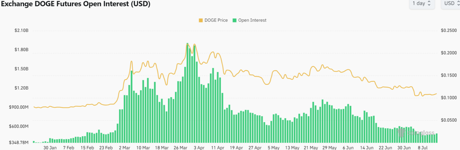 Đợt tăng giá mạnh vào cuối tháng 2 và tháng 3 đã chứng kiến DOGE tăng 176% chỉ sau hơn một tháng. Khi bắt đầu đợt tăng giá, hợp đồng mở ở mức 480 triệu USD và vào ngày 13 tháng 7, nó ở mức 478 triệu USD.