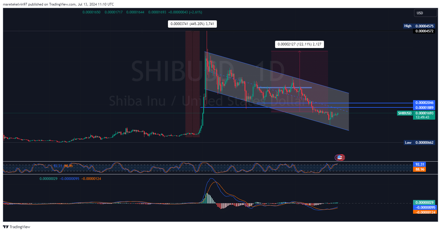 Shiba Inu (SHIB) đã chứng kiến đà phục hồi gần đây khi từ chối mức hỗ trợ của mô hình cờ tăng giá tại quanh $0,0000127. Kể từ khi từ chối hỗ trợ này vào ngày 5 tháng 7, SHIB đã tăng mạnh 31%.