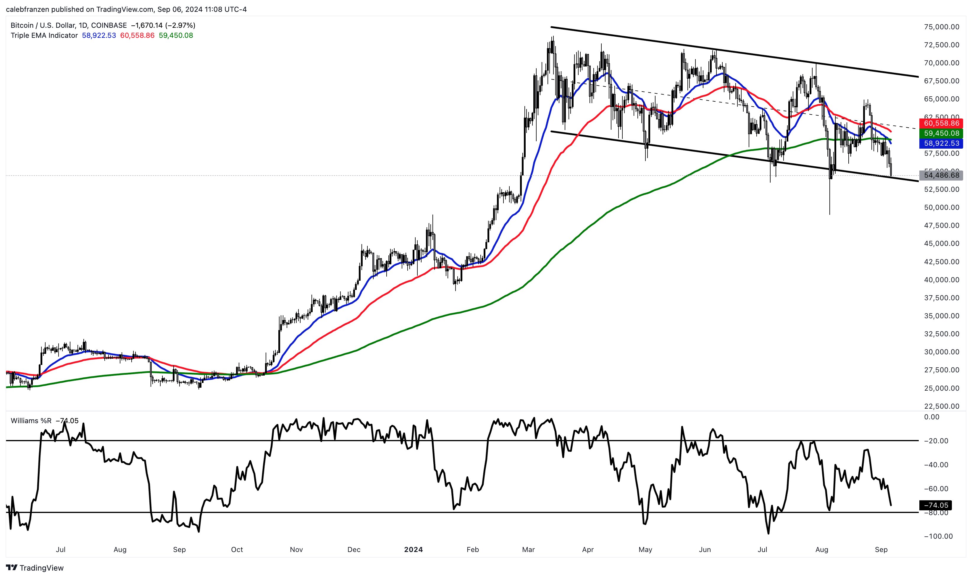 Theo Franzen, mức đóng cửa hàng ngày dưới $54.000 sẽ tiếp tục là một đáy thấp hơn sau một loạt các đỉnh thấp hơn. Điều này có thể khiến giá BTC giảm thêm nữa.