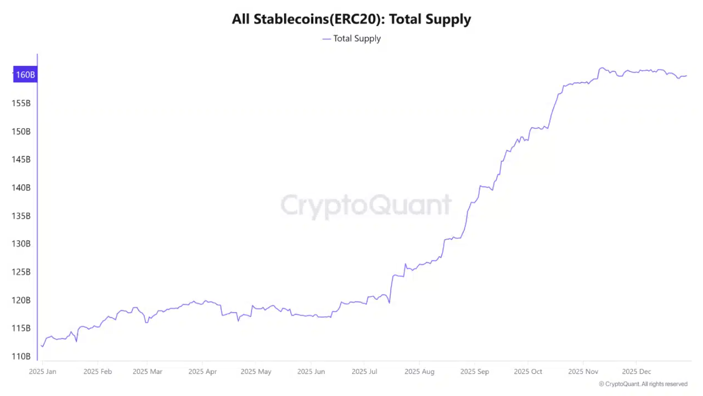 Nguồn cung stablecoin theo chuẩn ERC-20 liên tục gia tăng trong nửa cuối năm cho thấy tiền vẫn ở lại trong hệ sinh thái crypto — chỉ là chưa thực sự được kích hoạt. Nói cách khác, dòng vốn đang chờ tín hiệu rõ ràng hơn để nhập cuộc.