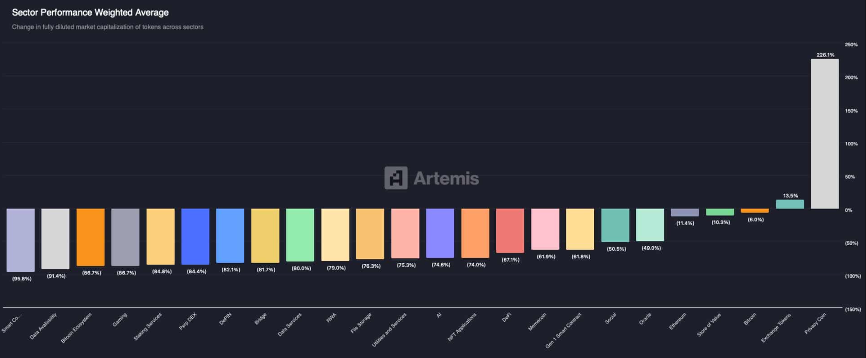 Hiện tượng này đang lặp lại với cổ phiếu AI và token AI. Chỉ riêng trong tháng qua, Artemis ghi nhận token AI mất 24,9%, và mức lỗ từ đầu năm đã lên tới 74,6%. Những con số này phản ánh bức tranh suy yếu chung của thị trường, và có thể trở nên tồi tệ hơn nếu cổ phiếu liên quan đến AI tiếp tục lao dốc.