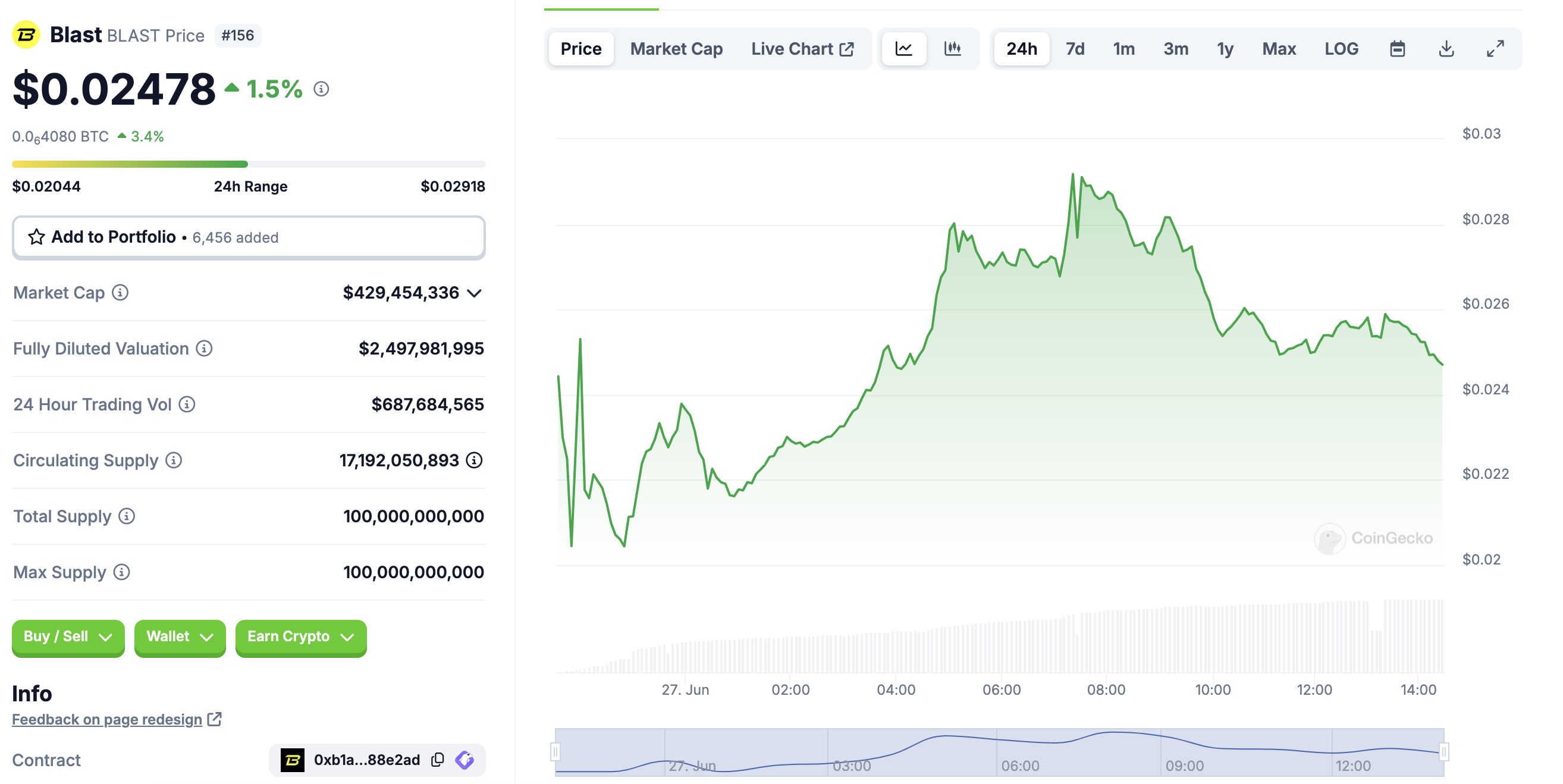 Giá của BLAST đã tăng hơn 40% lên mức $0,0281, hiện đã giảm nhẹ và đang giao dịch tại $0,024, theo dữ liệu từ Coingecko.