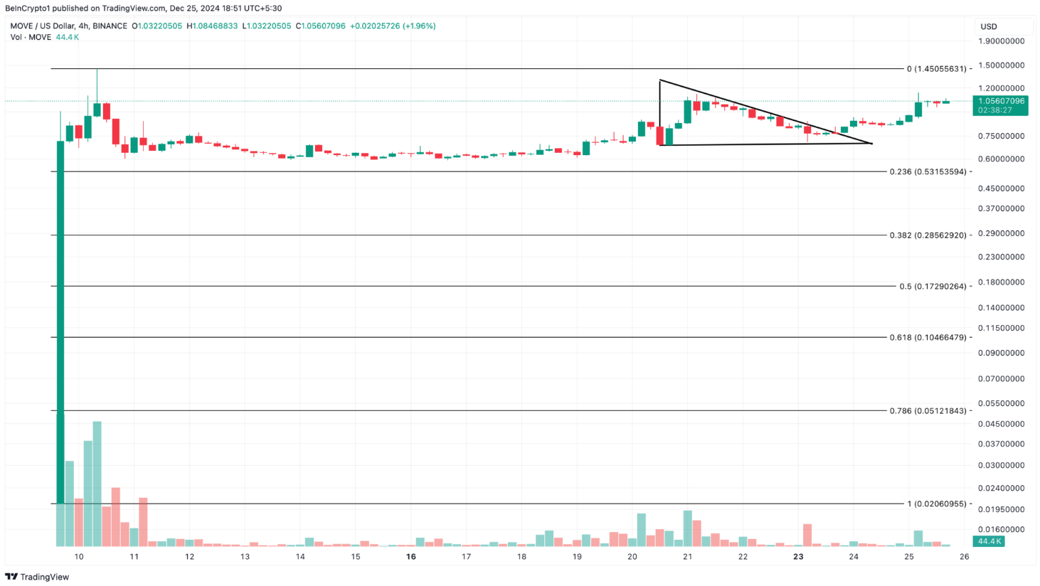 Tuy nhiên, giá MOVE không giảm xuống dưới đường hỗ trợ ngang mà thay vào đó đã tăng bứt phá lên trên. Với sự bứt phá này, token có khả năng tăng lên mức $1,45. Trong một kịch bản cực kỳ lạc quan, giá trị của MOVE có thể nhảy vọt lên $2.