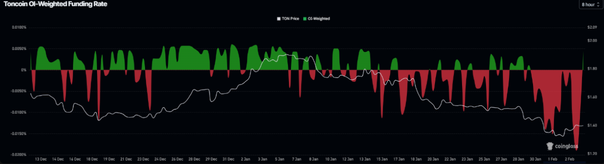 Bên cạnh đó, dữ liệu OI-Weighted Funding Rate từ CoinGlass cho thấy số nhà giao dịch tin vào khả năng giá TON giảm đang thấp hơn đáng kể so với nhóm kỳ vọng xu hướng tăng. Việc chỉ báo này đảo chiều sang vùng dương, đạt 0,0045% vào thứ Tư, đồng nghĩa phe bò đang chấp nhận trả phí cho phe gấu, một tín hiệu thường được xem là yếu tố ủng hộ triển vọng phục hồi trong ngắn hạn của TON.