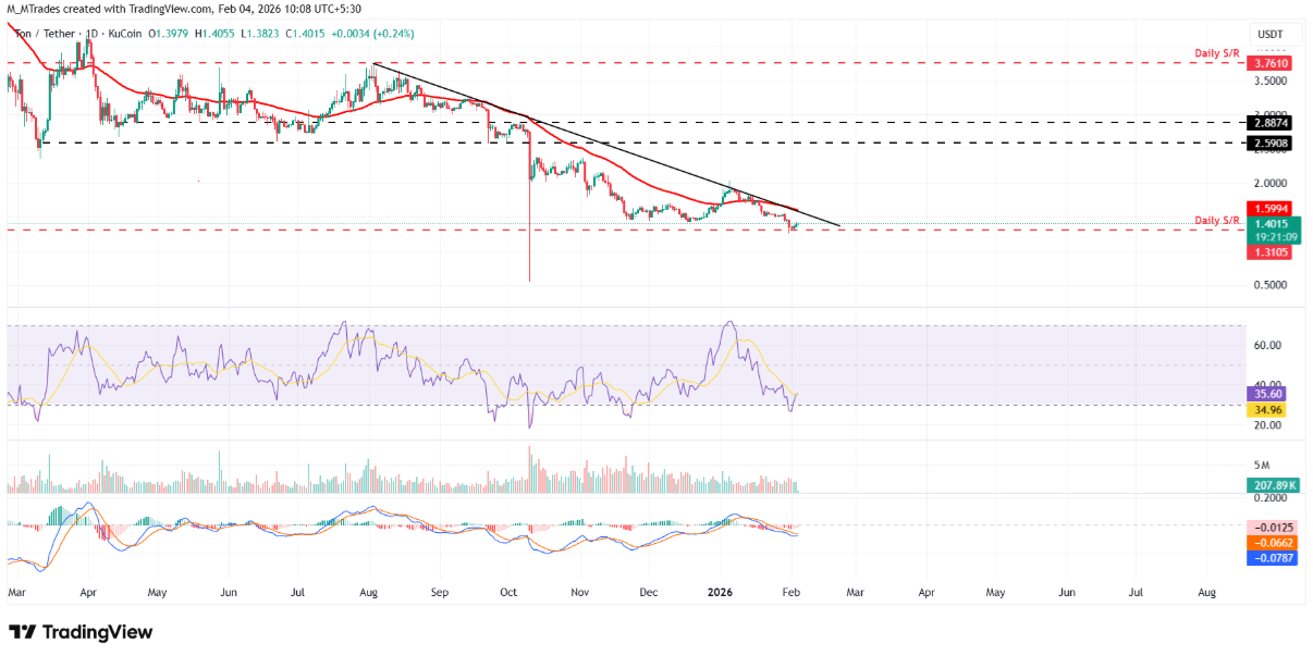Giá Toncoin đã trải qua nhịp điều chỉnh mạnh hơn 11% trong tuần trước, lùi về kiểm tra vùng hỗ trợ ngày quanh mốc 1,31 USD. Bước sang đầu tuần này, lực cầu đã xuất hiện tại vùng hỗ trợ quan trọng này, giúp TON phục hồi khoảng 4,5% tính đến hết thứ Ba. Tại thời điểm ghi nhận vào thứ Tư, đồng coin này đang giao dịch quanh mức 1,40 USD.
