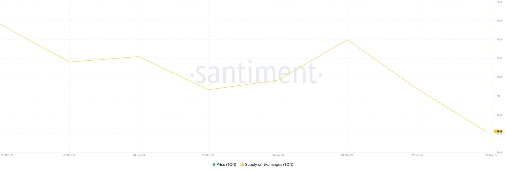 Nguồn cung TON trên các sàn giao dịch đã giảm từ 1,75 triệu vào ngày 1 tháng 12 xuống còn 1,68 triệu vào thời điểm viết bài, cho thấy các hodler đã rút khoảng 800.000 TON khỏi các sàn giao dịch trong ba ngày qua.