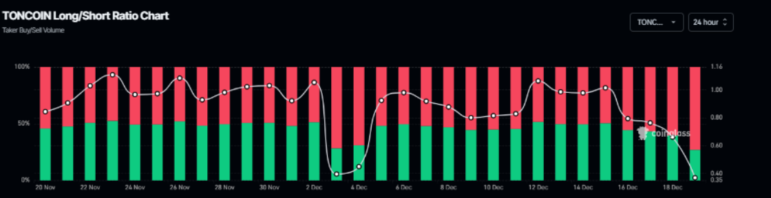 Bên cạnh đó, tỷ lệ long-to-short của Toncoin được ghi nhận ở mức 0,36 vào thứ Sáu – mức cao nhất trong vòng một tháng. Việc tỷ lệ này duy trì dưới ngưỡng 1 phản ánh tâm lý bi quan ngày càng lan rộng trên thị trường, khi phần lớn trader đang nghiêng về kịch bản giá tiếp tục suy giảm.