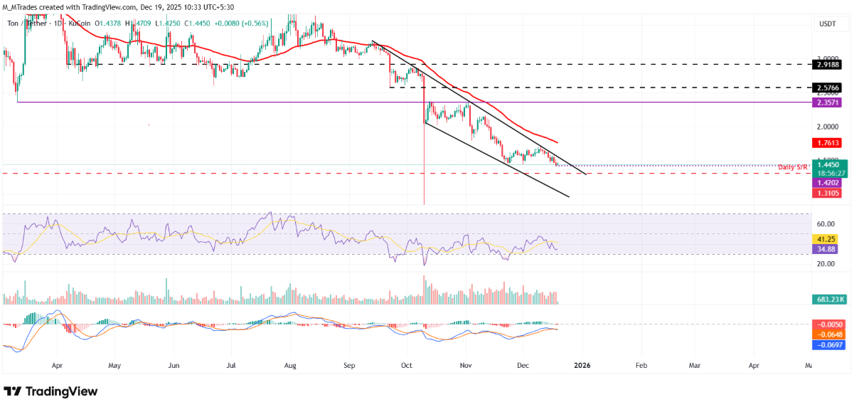 Giá Toncoin đã bị từ chối mạnh tại đường xu hướng trên của mô hình cái nêm giảm (falling wedge) vào ngày 10/12, kéo theo nhịp điều chỉnh gần 14%, rơi xuống 1,42 USD – mức thấp nhất trong vòng hai tháng – vào thứ Năm. Sang phiên thứ Sáu, TON chỉ hồi phục nhẹ và dao động quanh ngưỡng 1,45 USD, cho thấy áp lực bán vẫn chưa hạ nhiệt.