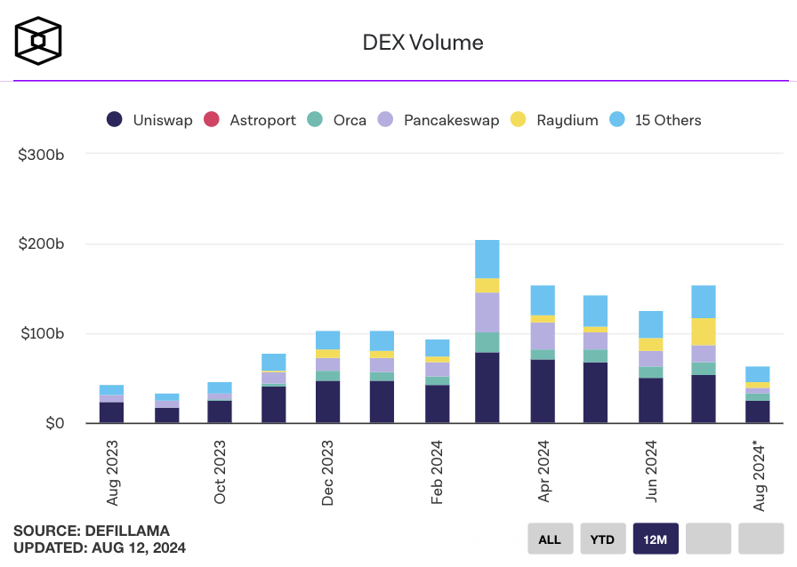 Điều này xảy ra khi Uniswap vẫn thống trị phân khúc DEX, chiếm gần một phần ba tổng khối lượng DEX trong tháng 7. Ví dụ, trong tổng số 154 tỷ đô la khối lượng swap trong tháng, Uniswap đã chứng kiến 54 tỷ đô la được giao dịch.