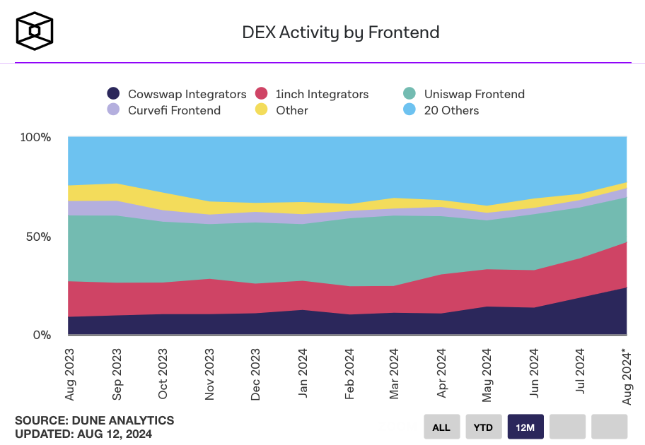 Người dùng muốn tránh phí giao dịch có thể sử dụng các công cụ tổng hợp DEX như 1inch, Cowswap và Paraswap. Vào tháng 7, Uniswap chiếm 25,7% hoạt động DEX, so với 1inch, công cụ tổng hợp DEX được sử dụng nhiều nhất, chiếm 19,8%. Điều này được đo lường theo tỷ lệ hoạt động hàng tháng do các công cụ giao dịch DEX tạo ra.