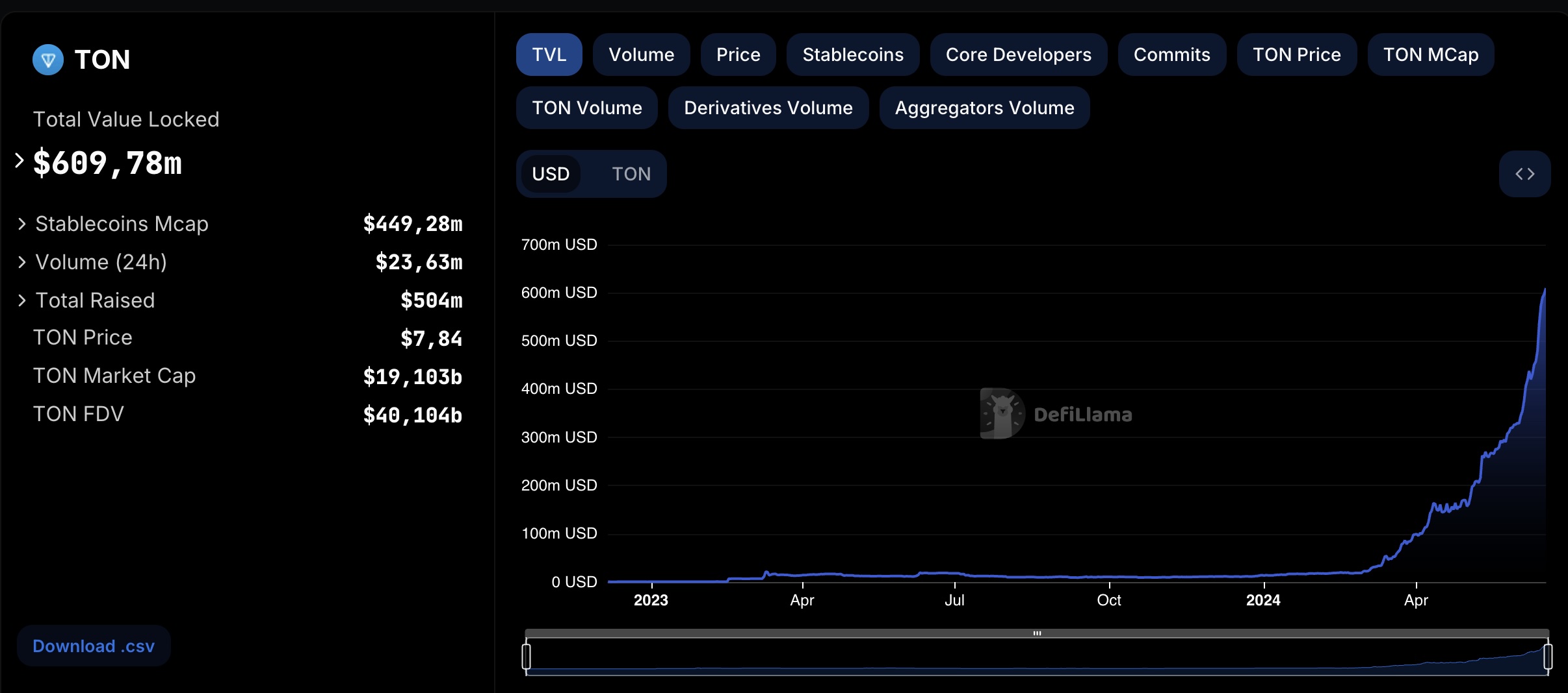 The Open Network (TON) blockchain đã tăng vọt lên 609,78 triệu USD tổng giá trị khóa (TVL) vào thứ Hai, theo dữ liệu từ DefiLlama. Điều này xảy ra chỉ ba tuần sau khi TVL của mạng ghi nhận 300 triệu USD.