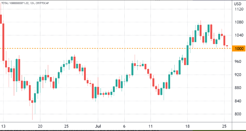 Tổng vốn hóa thị trường tiền điện tử đã vượt qua mốc 1 nghìn tỷ đô la vào ngày 18/7 sau khoảng thời gian 35 ngày đau đớn dưới mức tâm lý quan trọng này. Trong 7 ngày tiếp theo, Bitcoin giao dịch đi ngang ở mức 22.400 đô la và ETH điều chỉnh 0,5% xuống 1.560 đô la.