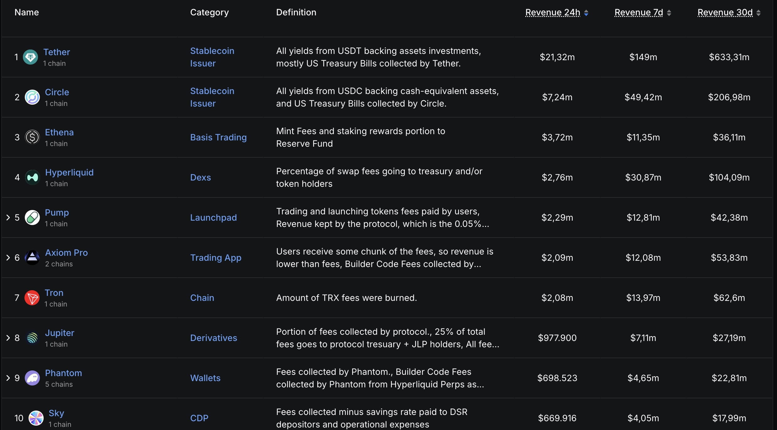 Top 10 giao thức crypto tạo ra 1,2 tỷ USD doanh thu trong 30 ngày