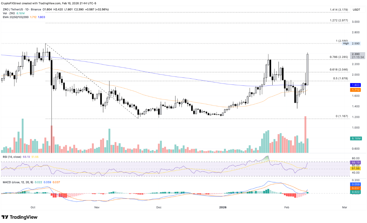 Về mặt kỹ thuật, token ZRO đã bứt phá lên trên ngưỡng Fibonacci thoái lui 78,6% tại 2,28 USD, được xác định từ đỉnh ngày 7/10 ở 2,59 USD xuống đáy ngày 21/11 tại 1,16 USD. Nếu giá duy trì đóng cửa dứt khoát trên vùng này, đà tăng có thể được mở rộng hướng tới mốc 2,59 USD, trước khi đối mặt với ngưỡng kháng cự tiếp theo tại mức Fibonacci mở rộng 1,272 quanh 2,97 USD.