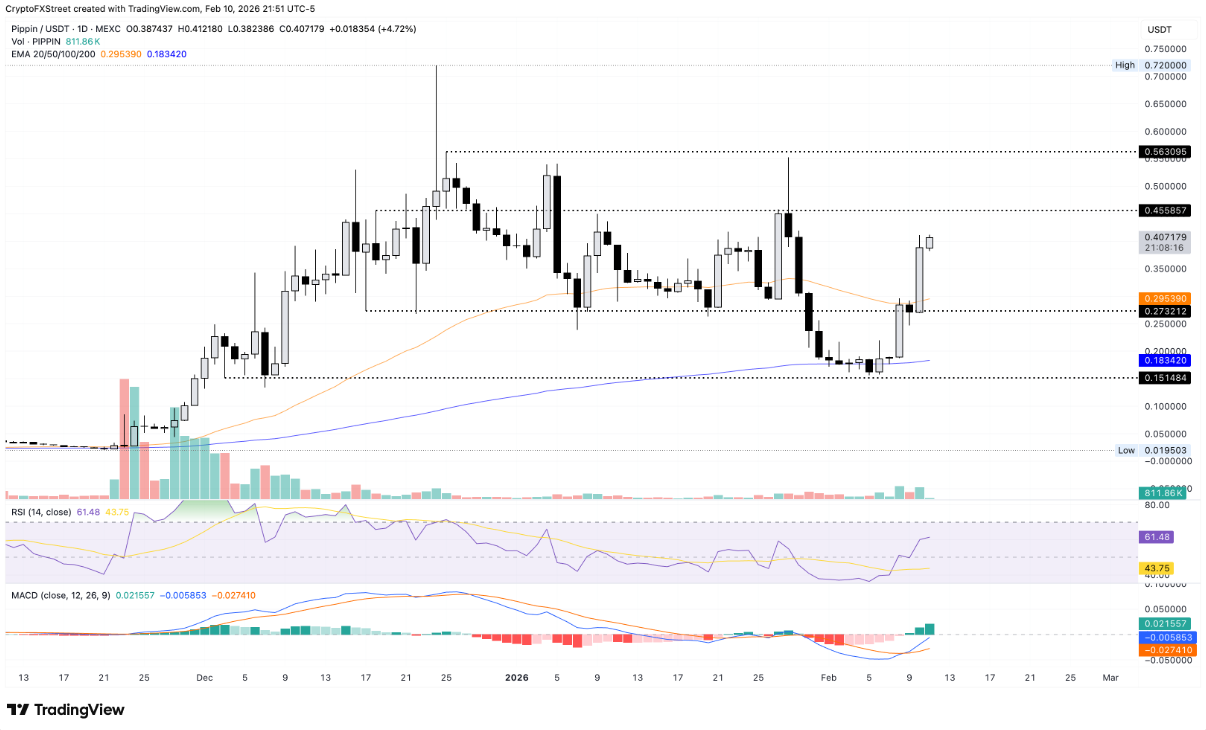 Trên biểu đồ ngày, mô hình đảo chiều hình chữ U xuất phát từ đường EMA 200 ngày tại 0,1833 USD đang dần hoàn thiện và tiến sát vùng kháng cự then chốt 0,4558 USD — trùng với đỉnh thiết lập ngày 18/12. Nếu giá có thể đóng cửa dứt khoát trên ngưỡng này, PIPPIN nhiều khả năng sẽ mở rộng đà tăng để kiểm tra mốc 0,5630 USD, tương ứng với đỉnh ngày 25/12.