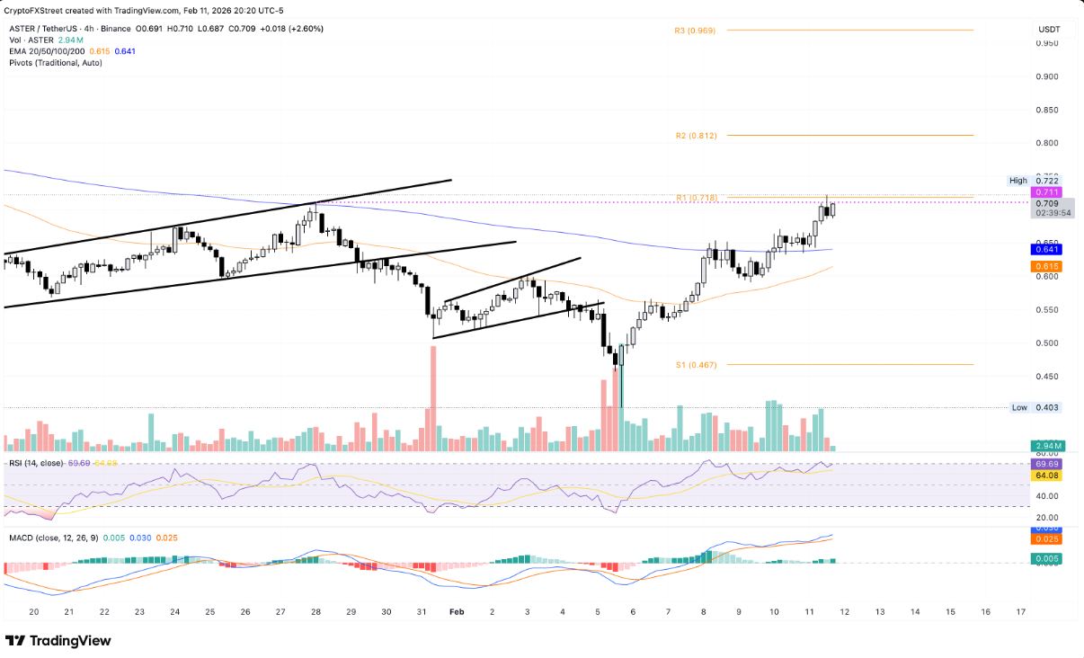 Aster tiếp tục duy trì nhịp phục hồi ấn tượng kể từ khi thiết lập đáy lịch sử 0,403 USD vào ngày 6/2, ghi nhận mức tăng hơn 50% chỉ trong vòng sáu ngày. Tại thời điểm viết bài vào thứ Năm, token của sàn giao dịch chuyên về hợp đồng vĩnh cửu này đang giao dịch trên mốc 0,700 USD, tăng khoảng 3% trong ngày và cho thấy lực cầu vẫn hiện diện rõ rệt.