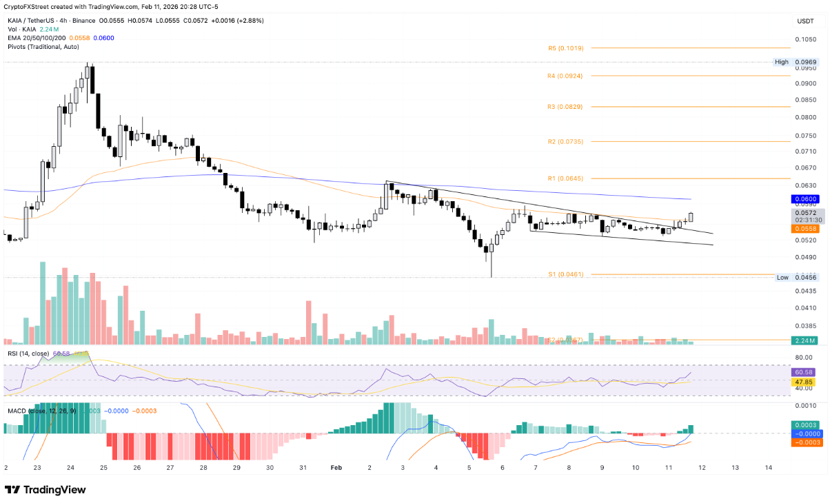 Kaia đã bứt phá thành công khỏi mô hình cái nêm giảm trên khung thời gian 4 giờ, vốn hình thành từ đầu tháng 2 — một tín hiệu cho thấy động lực tăng giá bị nén đã được giải phóng. Tại thời điểm ghi nhận vào ngày thứ Năm, KAIA tăng hơn 2%, đồng thời vượt lên và giữ vững trên đường EMA 50 kỳ tại vùng 0,0558 USD.