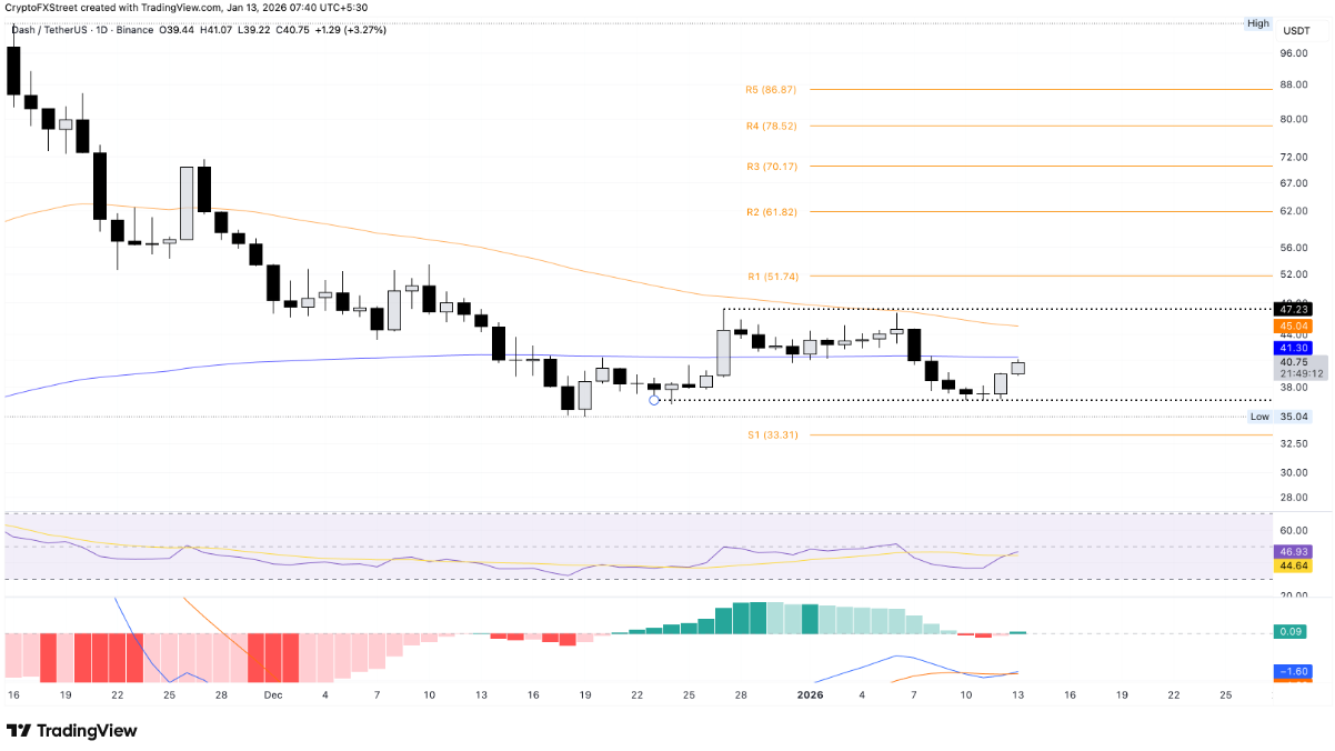 Dash ghi nhận mức tăng 3% tại thời điểm viết bài vào thứ Ba, tiếp nối đà bứt phá 6% của phiên trước đó. Đợt phục hồi của tiền điện tử chú trọng quyền riêng tư này, khởi phát từ vùng đáy ngày 23/12 quanh mốc 36,68 USD, đang đưa giá tiến sát đường trung bình động hàm mũ (EMA) 200 ngày tại 41,30 USD.