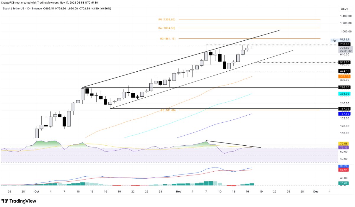 Zcash hiện giao dịch trên 700 USD trong phiên thứ Hai, đánh dấu chuỗi 5 ngày tăng liên tiếp và nối dài nhịp phục hồi trong mô hình kênh tăng rộng hơn. Dù vậy, việc phe bò vẫn chưa thể vượt qua đỉnh 750 USD thiết lập ngày 7/11 đang làm gia tăng nguy cơ hình thành mô hình hai đỉnh (double top) — tín hiệu có thể mở ra một pha đảo chiều giảm.
