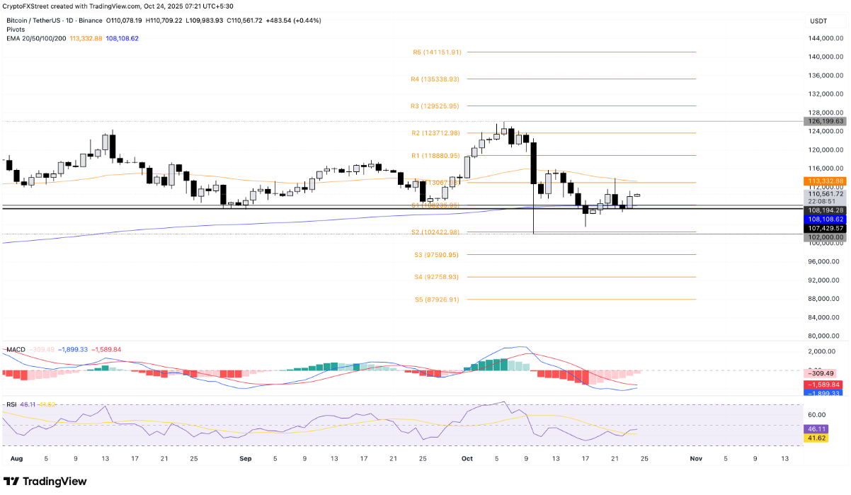 Tính đến trưa thứ Sáu, Bitcoin đang giao dịch trên 110.000 USD, ghi nhận mức tăng 2% trong 24 giờ qua. Tuy nhiên, đà hồi phục này có thể sớm đối mặt với lực cản quan trọng tại đường EMA 50 ngày, nằm quanh 113.334 USD – trùng khớp với mốc Pivot trung tâm.