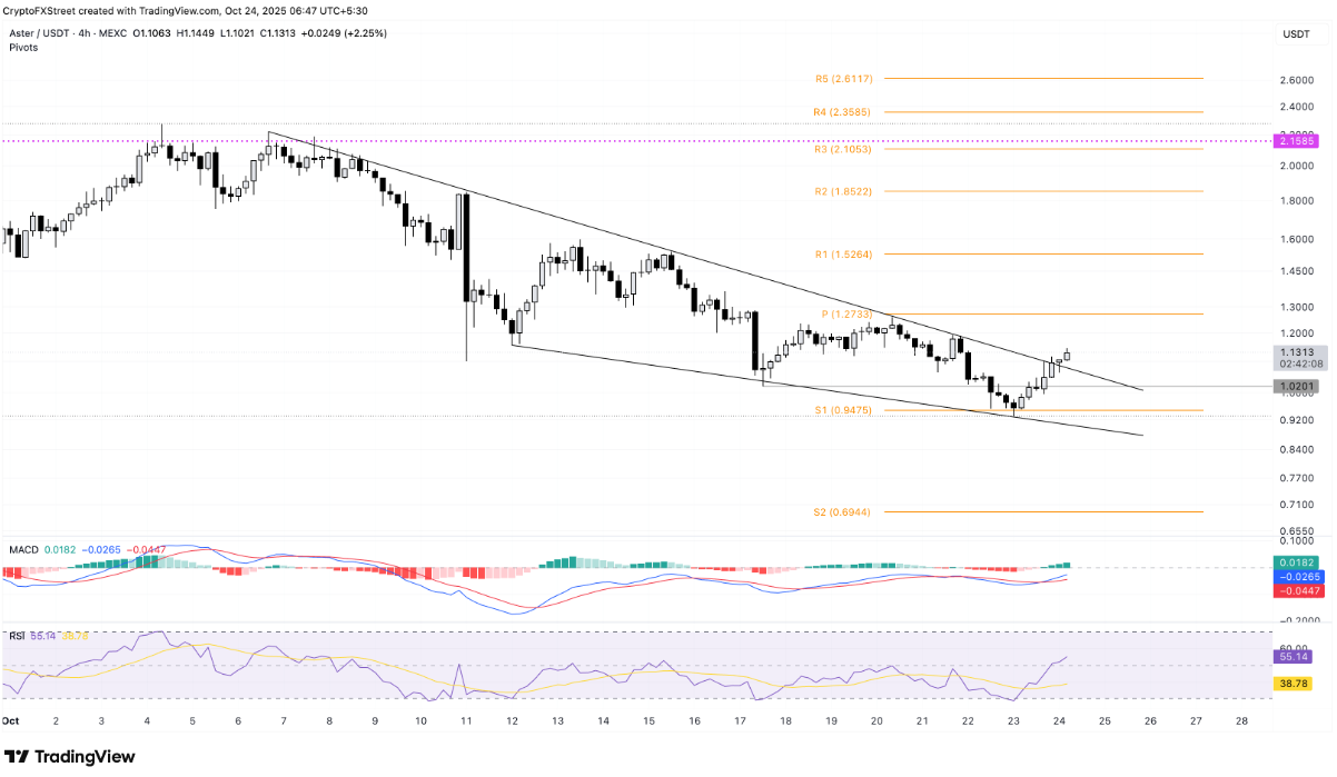 Giá Aster (ASTER) tiếp tục duy trì đà tăng, nhích thêm 1% trong phiên hôm nay, nối dài chuỗi tăng 15% của ngày thứ Năm. Token của sàn giao dịch phi tập trung (DEX) này đang củng cố tín hiệu phá vỡ khỏi mô hình cái nêm giảm (falling wedge) trên khung 4 giờ – một cấu trúc thường báo hiệu khả năng đảo chiều tăng.