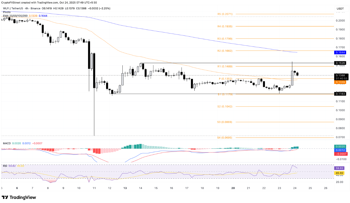 World Liberty Financial (WLFI) giữ vững vùng giá trên 0,1350 USD trong phiên thứ Sáu, sau cú bứt phá 16% ở ngày giao dịch liền trước. Trên khung 4 giờ, WLFI tiếp tục dao động trong biên độ hẹp, với vùng hỗ trợ tại 0,1183 USD và kháng cự mạnh quanh 0,1526 USD.