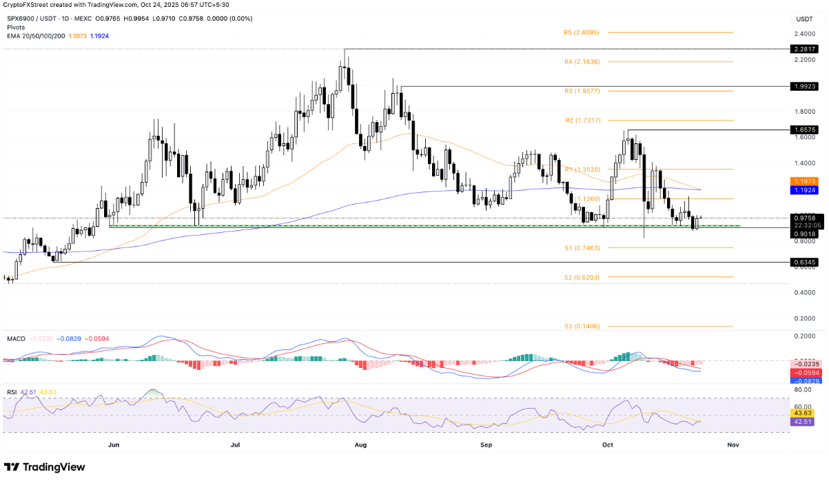SPX6900 (SPX) vẫn đang chật vật lấy lại ngưỡng tâm lý 1 USD, dù đã bật tăng 9% trong phiên thứ Năm từ vùng cầu 0,9018 USD. Hiện token này giao dịch quanh 0,9700 USD, qua đó duy trì phần lớn mức tăng đạt được trước đó.