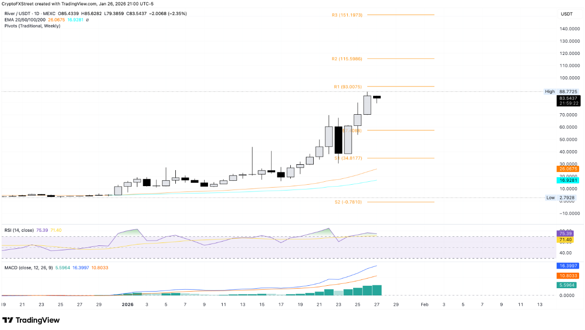 Về kỹ thuật, vùng kháng cự gần nhất của RIVER được xác định tại mốc pivot R1 quanh 93 USD, trước khi hướng tới mục tiêu cao hơn tại pivot R2 ở 115 USD.