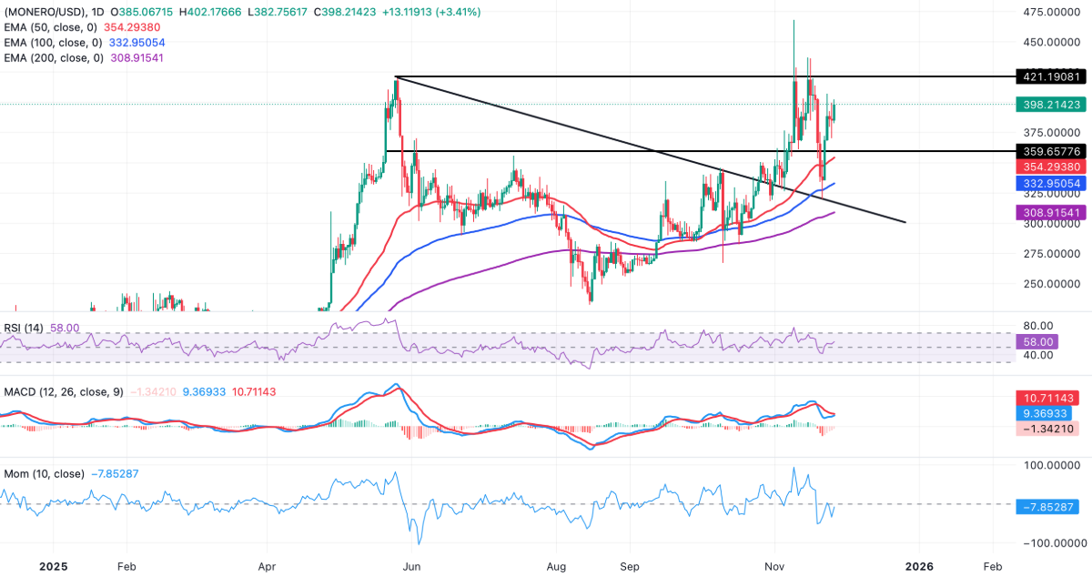 Monero (XMR) hiện đang giao dịch quanh mức 398 USD, duy trì trên các đường Trung bình động hàm mũ (EMA) quan trọng: đường EMA 50 ngày tại 354 USD, đường EMA 100 ngày ở 332 USD và đường EMA 200 ngày tại 308 USD, củng cố mạnh mẽ xu hướng tăng trên biểu đồ kỹ thuật.