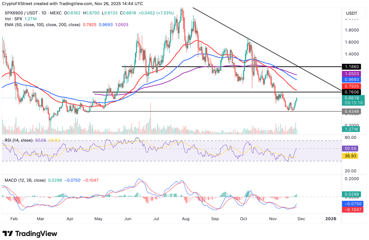 Tuy nhiên, đường EMA 50 ngày tại 0,79 USD có thể tạo ra ngưỡng cản, khiến nhịp hồi bị hạn chế và kích hoạt các đợt chốt lời sớm. Nếu SPX6900 bứt phá đường EMA này, nhiều khả năng xu hướng tăng sẽ tiếp diễn, hướng tới đường EMA 100 ngày ở 0,96 USD và EMA 200 ngày tại 1,05 USD.